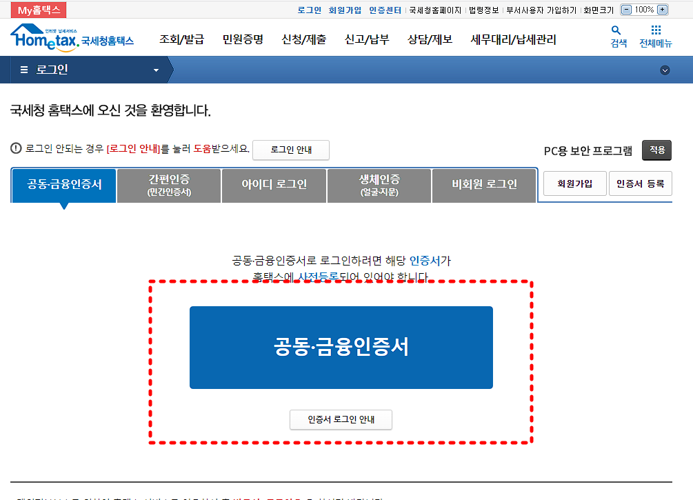 ▶ 공동 인증서 및 금융인증서로 로그인
