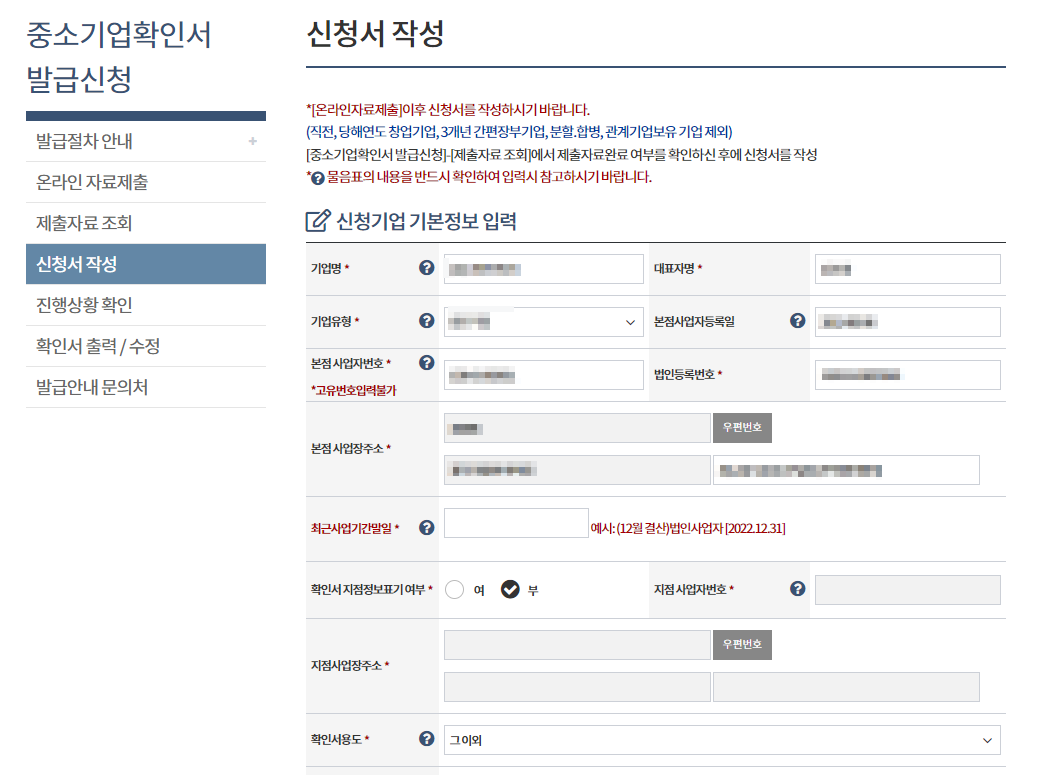- 중소기업확인서 발급신청 > 온라인 자료제출, 신청서 작성 필수