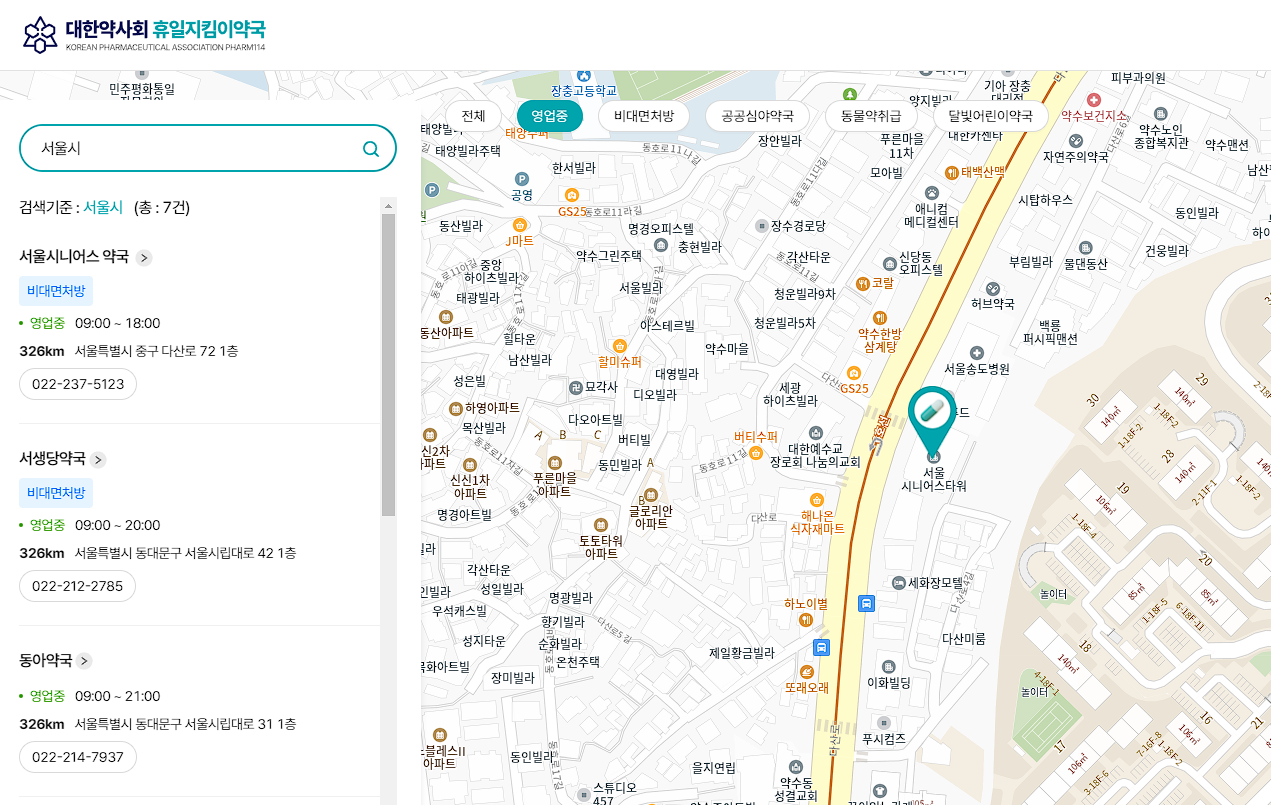 또한 지역을 검색 한 후, 영업중 약국, 비대면 처방 가능한 약국, 공공심야약국, 달빛 어린이 약국 및 동물 약 취급 약국도 조회가 가능합니다.