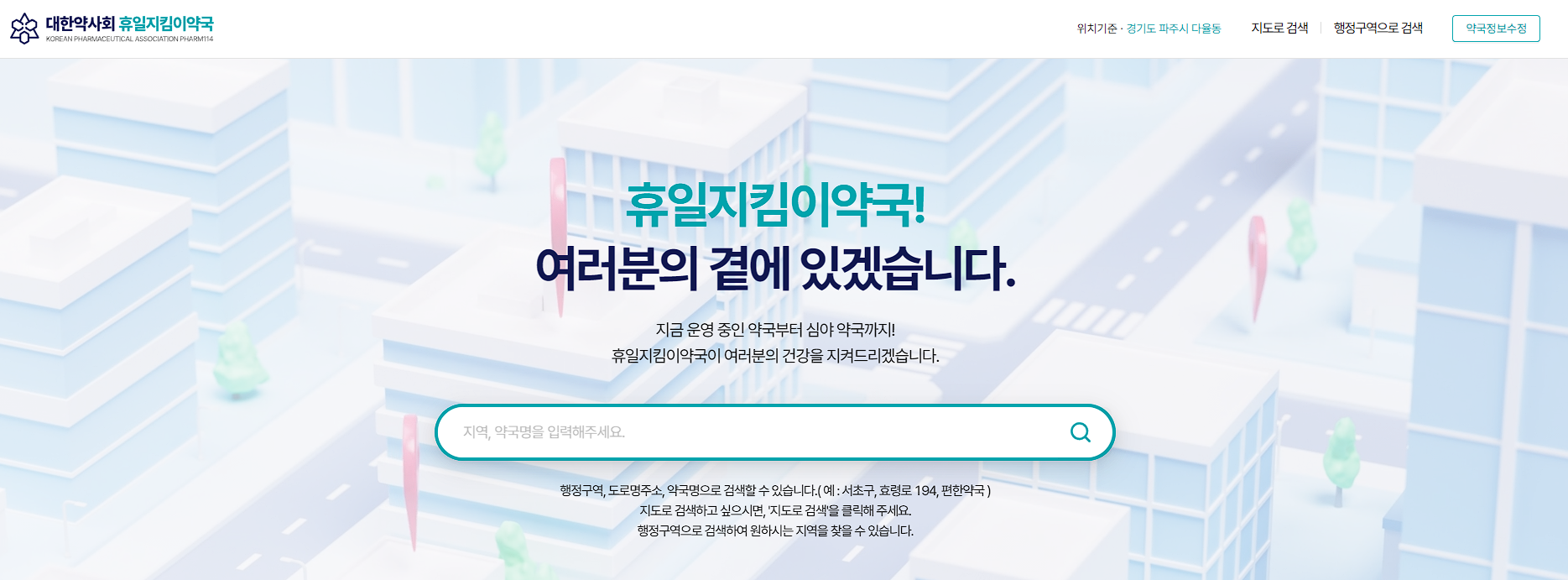 휴일 지킴이 약국 (pharm114.or.kr) 사이트에서 조회하기