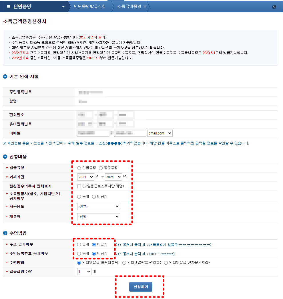▶ 소득 금액 증명 신청서 작성 (신청 내용 / 수령방법 체크)