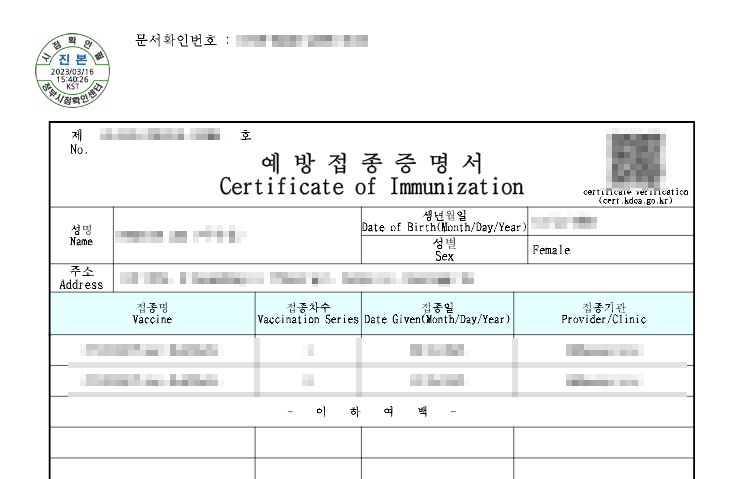 - 개인정보 : 개인 접종 증명이기때문에 개인 인적사항 (성명, 생일, 성별, 국적 등) 기재해야 합니다.